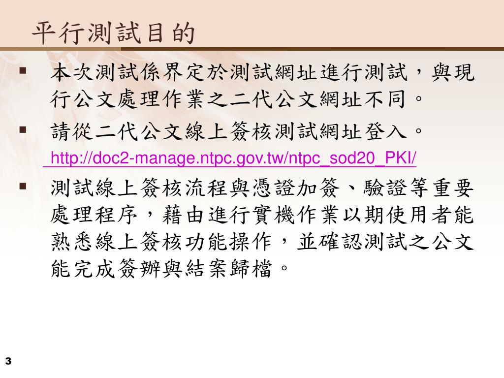 平行測試目的 • 本次測試係界定於測試網址進行測試,與現行公文處理作業之二代公文網址不同。 • 請從二代公文線上簽核測試網址登入。 http://doc2-manage.ntpc.gov.tw/ntpc_sod20_PKI/ • 測試線上簽核流程與憑證加簽、驗證等重要處理程序,藉由進行實機作業以期使用者能熟悉線上簽核功能操作,並確認測試之公文能完成簽辦與結案歸檔。