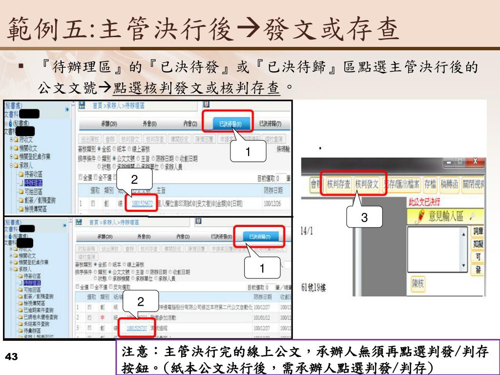 範例五:主管決行後發文或存查 『待辦理區』的『已決待發』或『已決待歸』區點選主管決行後的公文文號點選核判發文或核判存查。 1 2 3 1 2 注意:主管決行完的線上公文,承辦人無須再點選判發/判存按鈕。(紙本公文決行後,需承辦人點選判發/判存)