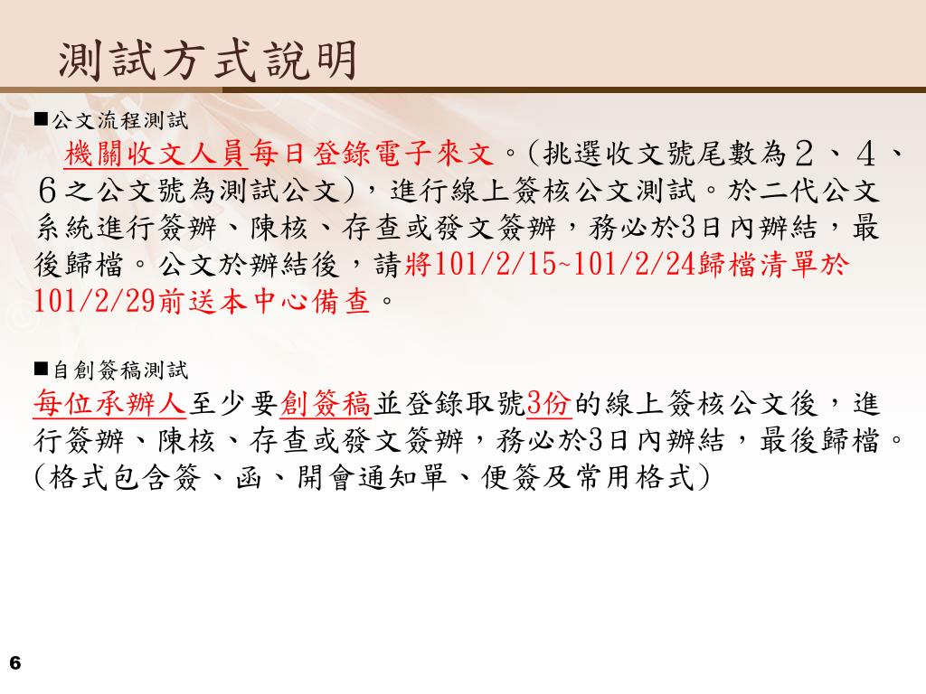 測試方式說明 • 公文流程測試 • 機關收文人員每日登錄電子來文。(挑選收文號尾數為2、4、6之公文號為測試公文),進行線上簽核公文測試。於二代公文系統進行簽辦、陳核、存查或發文簽辦,務必於3日內辦結,最後歸檔。公文於辦結後,請將101/2/15~101/2/24歸檔清單於101/2/29前送本中心備查。 • 自創簽稿測試 • 每位承辦人至少要創簽稿並登錄取號3份的線上簽核公文後,進行簽辦、陳核、存查或發文簽辦,務必於3日內辦結,最後歸檔。(格式包含簽、函、開會通知單、便簽及常用格式)