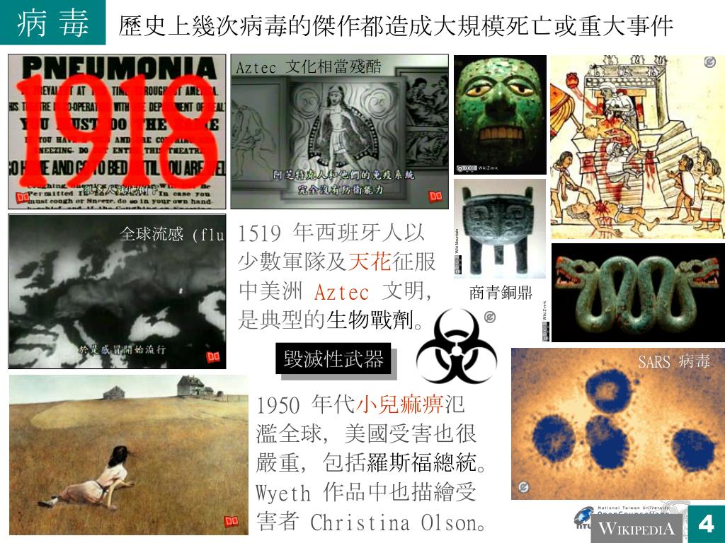 病 毒 Wiki Z-m-k Wiki Z-m-k Wiki Mountain 歷史上幾次病毒的傑作都造成大規模死亡或重大事件 Aztec 文化相當殘酷 1519 年西班牙人以少數軍隊及天花征服中美洲 Aztec文明,是典型的生物戰劑。 全球流感 (flu) 商青銅鼎 毀滅性武器 SARS 病毒 1950 年代小兒痲痹氾濫全球,美國受害也很嚴重,包括羅斯福總統。Wyeth 作品中也描繪受害者 Christina Olson。 4 WIKIPEDIA