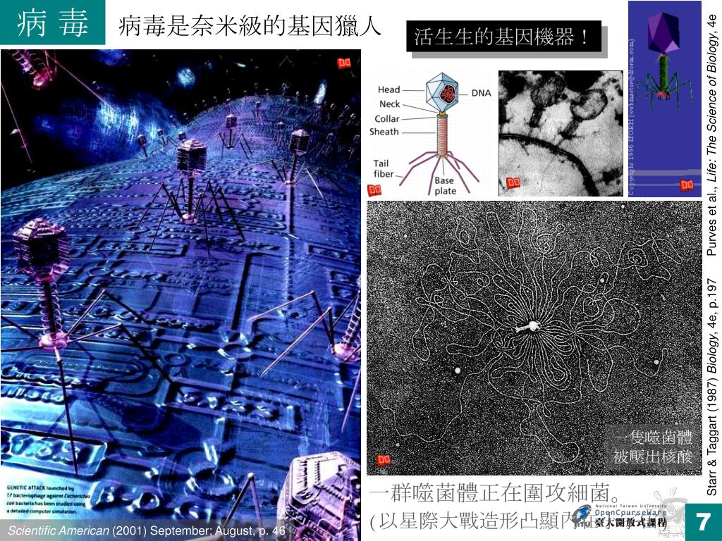 病 毒 病毒是奈米級的基因獵人 活生生的基因機器! Purves et al., Life: The Science of Biology, 4e Starr & Taggart (1987) Biology, 4e, p.197 一隻噬菌體 被壓出核酸 一群噬菌體正在圍攻細菌。 (以星際大戰造形凸顯內在小宇宙) 7 Scientific American (2001) September; August, p. 46