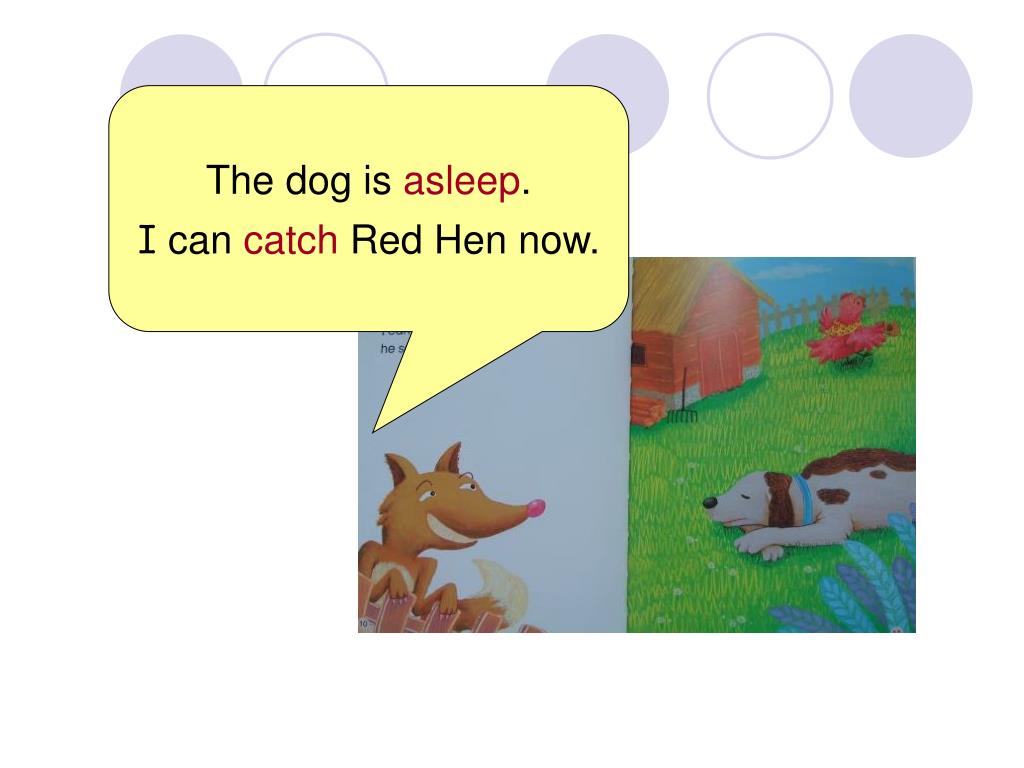 The dog is asleep. I can catch Red Hen now.