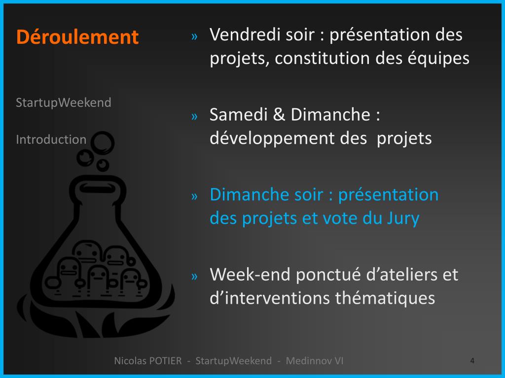 StartupWeekend Monde • Depuis 2007, 325 évènements, 503 startups crées et plus de 27 000 participants • La France est le 2ème Pays le plus actif derrière les U.S.A Déroulement StartupWeekend Introduction Nicolas POTIER - StartupWeekend - Medinnov VI