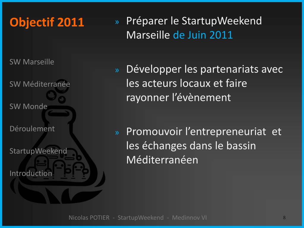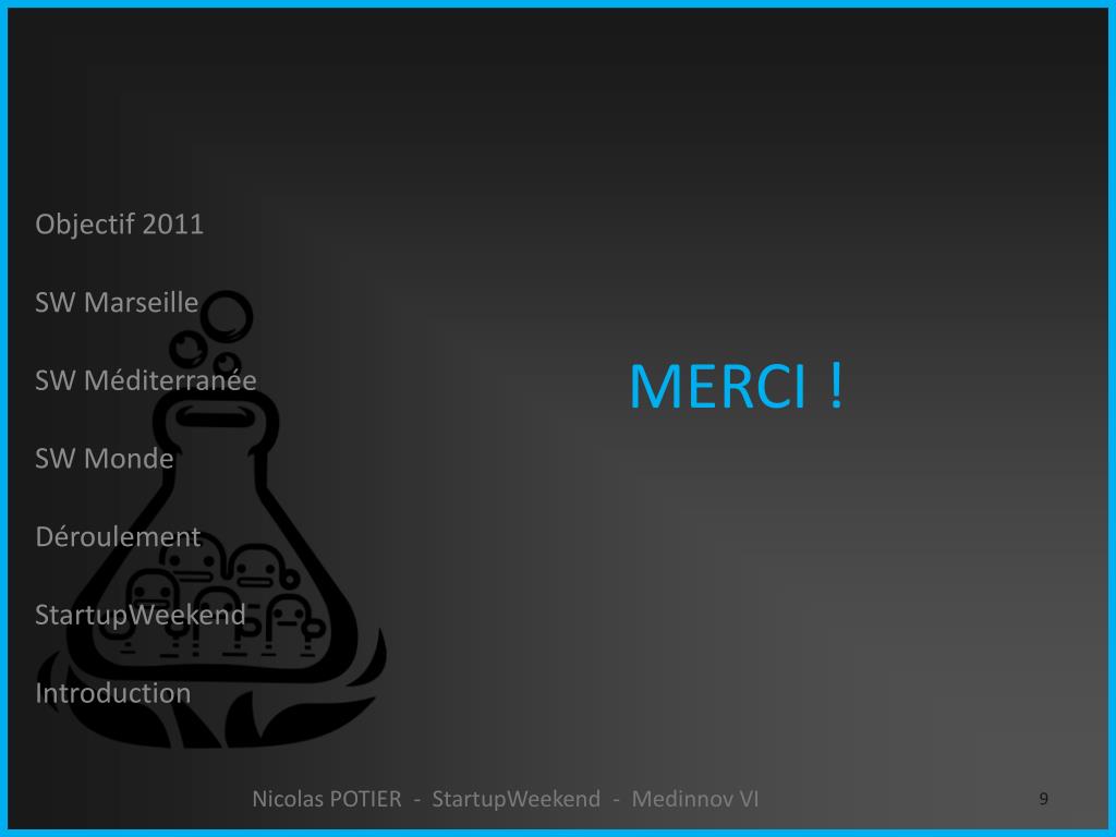 MERCI ! Objectif 2011 SW Marseille SW Méditerranée SW Monde Déroulement StartupWeekend Introduction Nicolas POTIER - StartupWeekend - Medinnov VI