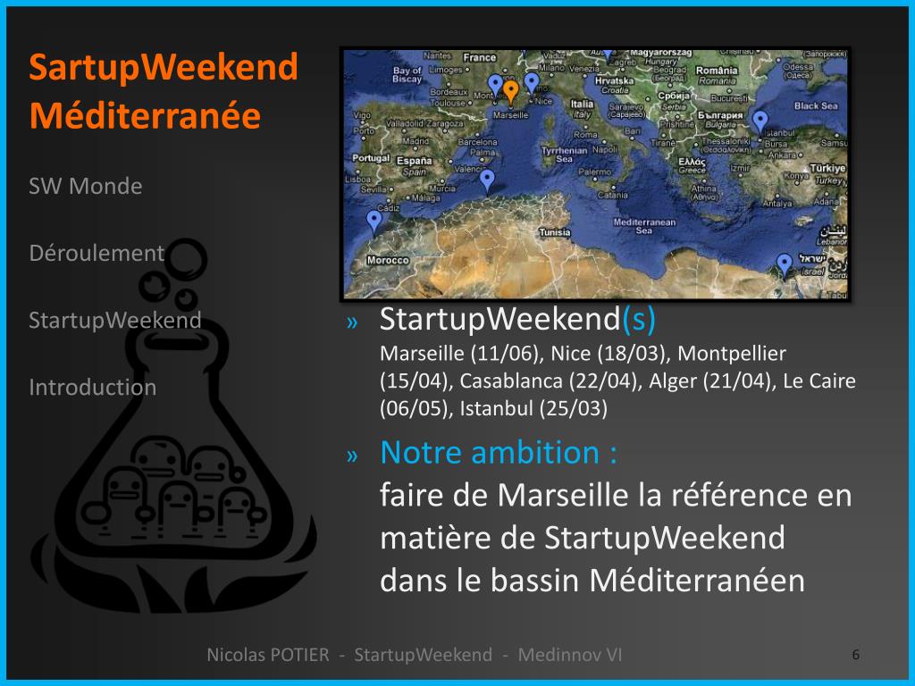 SartupWeekendMéditerranée • StartupWeekend(s)Marseille (11/06), Nice (18/03), Montpellier (15/04), Casablanca (22/04), Alger (21/04), Le Caire(06/05), Istanbul (25/03) • Notre ambition :faire de Marseille la référence en matière de StartupWeekend dans le bassin Méditerranéen SW Monde Déroulement StartupWeekend Introduction Nicolas POTIER - StartupWeekend - Medinnov VI