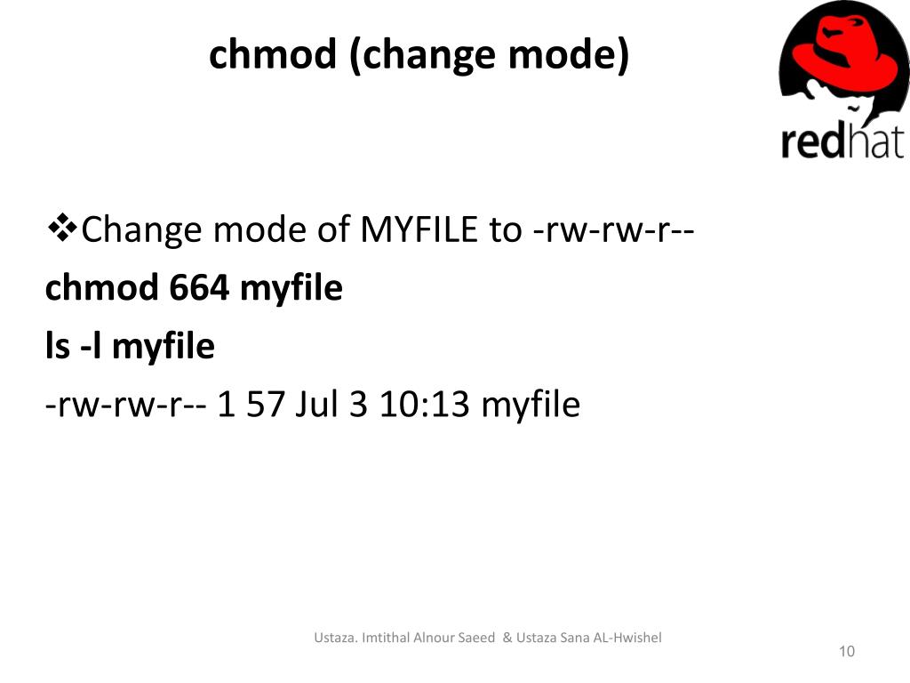 chmod (change mode) • Change mode of MYFILE to -rw-rw-r-- chmod 664 myfile ls -l myfile -rw-rw-r-- 1 57 Jul 3 10:13 myfile Ustaza. Imtithal Alnour Saeed & Ustaza Sana AL-Hwishel