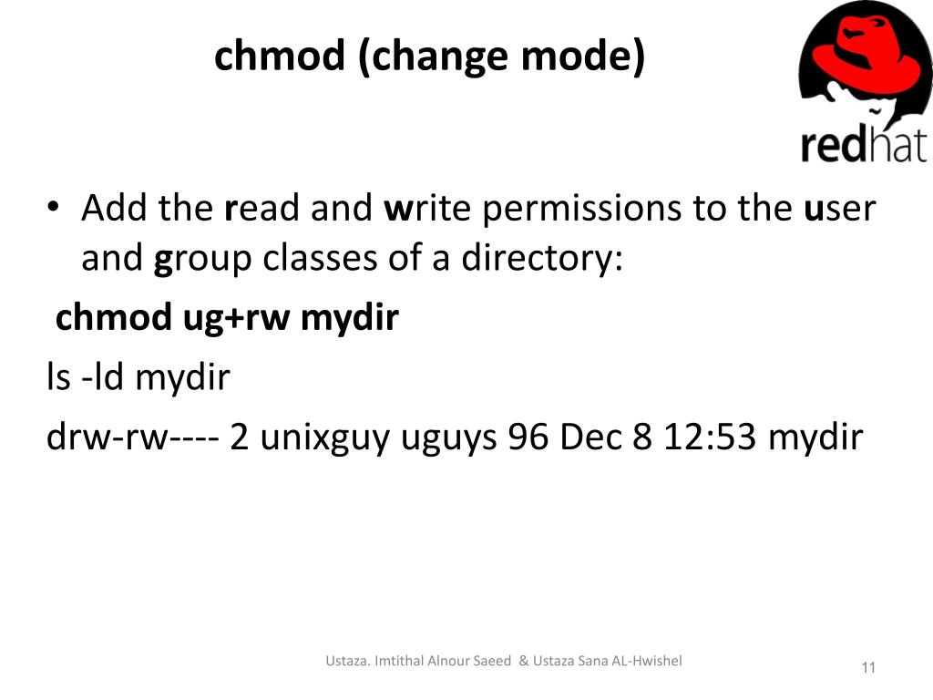 chmod (change mode) • Add the read and write permissions to the user and group classes of a directory: chmod ug+rw mydir ls -ld mydir drw-rw---- 2 unixguy uguys 96 Dec 8 12:53 mydir Ustaza. Imtithal Alnour Saeed & Ustaza Sana AL-Hwishel