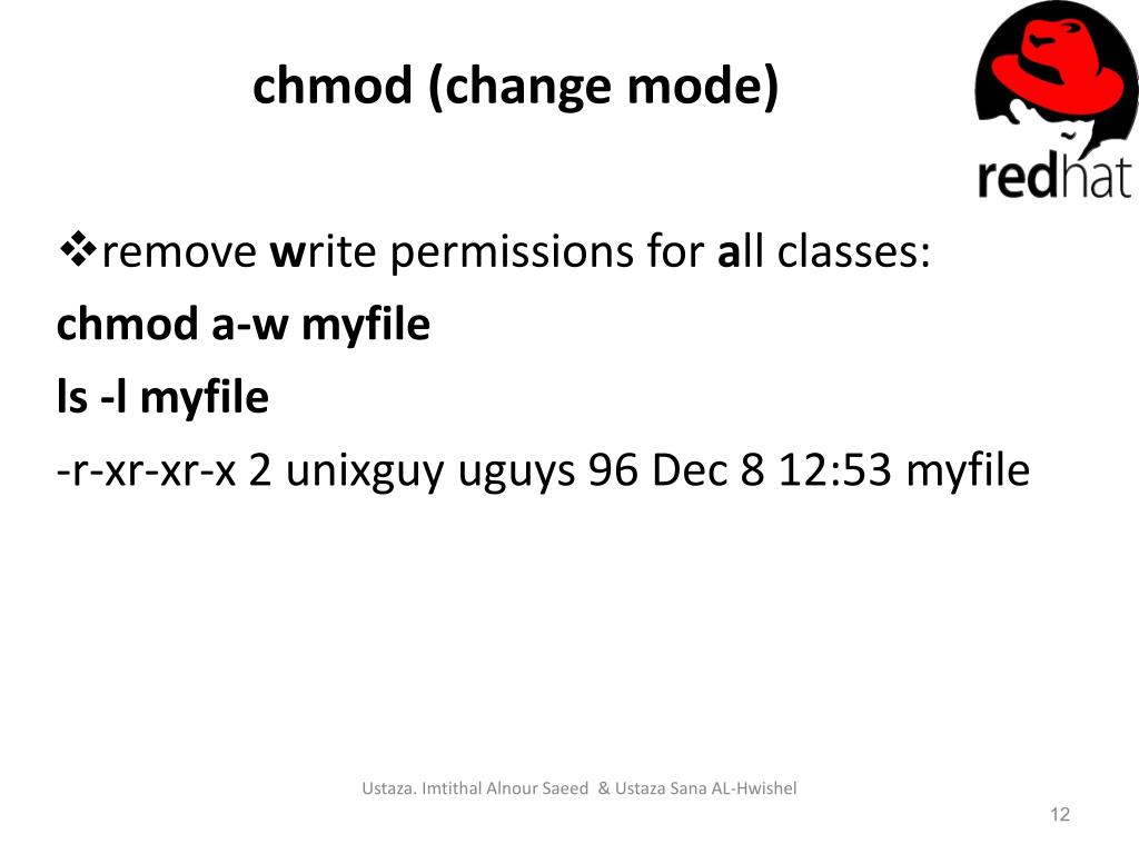 chmod (change mode) • remove write permissions for all classes: chmod a-w myfile ls -l myfile -r-xr-xr-x 2 unixguy uguys 96 Dec 8 12:53 myfile Ustaza. Imtithal Alnour Saeed & Ustaza Sana AL-Hwishel
