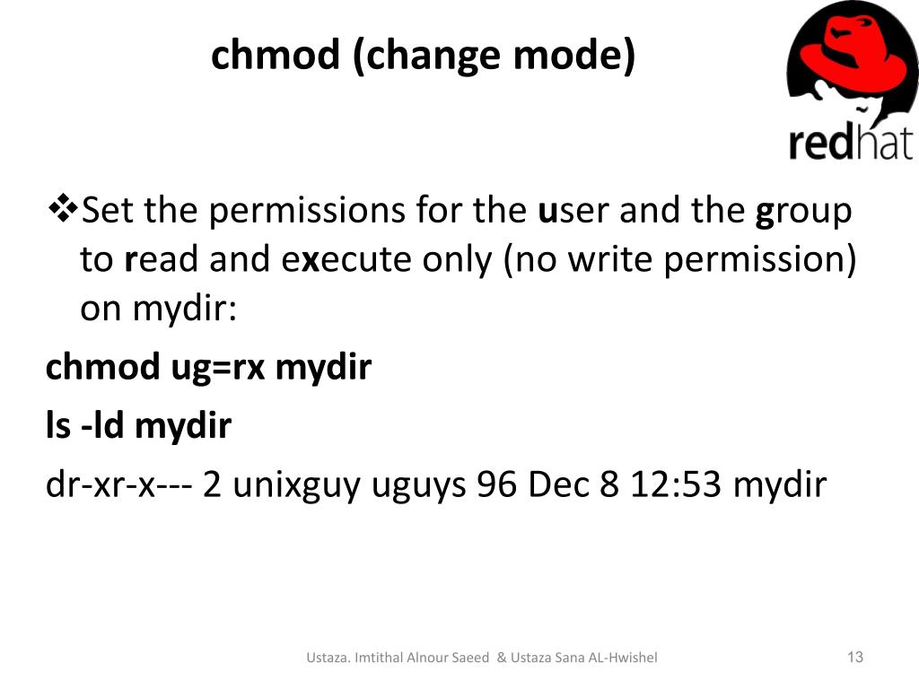 chmod (change mode) • Set the permissions for the user and the group to read and execute only (no write permission) on mydir: chmod ug=rx mydir ls -ld mydir dr-xr-x--- 2 unixguy uguys 96 Dec 8 12:53 mydir Ustaza. Imtithal Alnour Saeed & Ustaza Sana AL-Hwishel