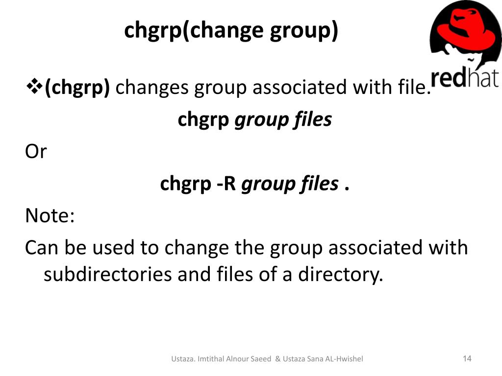 chgrp(change group) • (chgrp) changes group associated with file. chgrpgroupfiles Or chgrp -R group files . Note: Can be used to change the group associated with subdirectories and files of a directory. Ustaza. Imtithal Alnour Saeed & Ustaza Sana AL-Hwishel