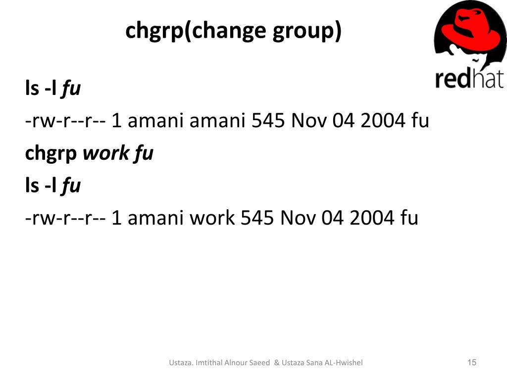 chgrp(change group) ls -l fu -rw-r--r-- 1 amani amani 545 Nov 04 2004 fu chgrp workfu ls -l fu -rw-r--r-- 1 amani work 545 Nov 04 2004 fu Ustaza. Imtithal Alnour Saeed & Ustaza Sana AL-Hwishel