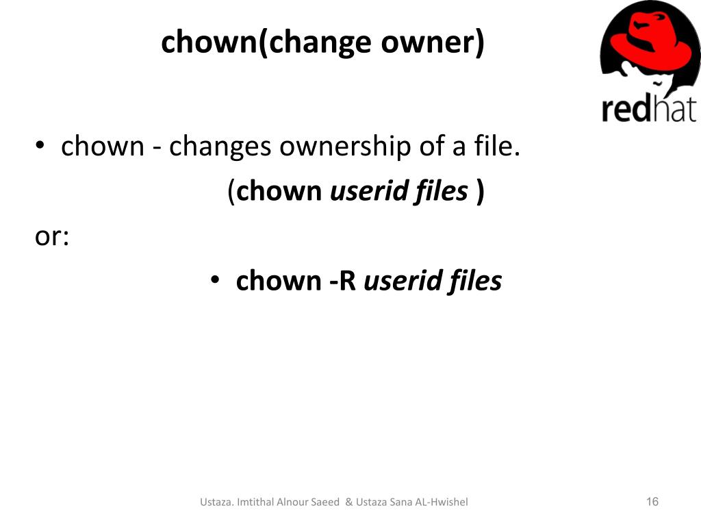 chown(change owner) • chown - changes ownership of a file. (chown userid files ) or: • chown -R userid files Ustaza. Imtithal Alnour Saeed & Ustaza Sana AL-Hwishel