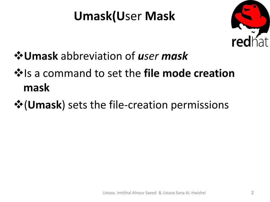 Umask(User Mask • Umask abbreviation of user mask • Is a command to set the file mode creation mask • (Umask) sets the file-creation permissions Ustaza. Imtithal Alnour Saeed & Ustaza Sana AL-Hwishel