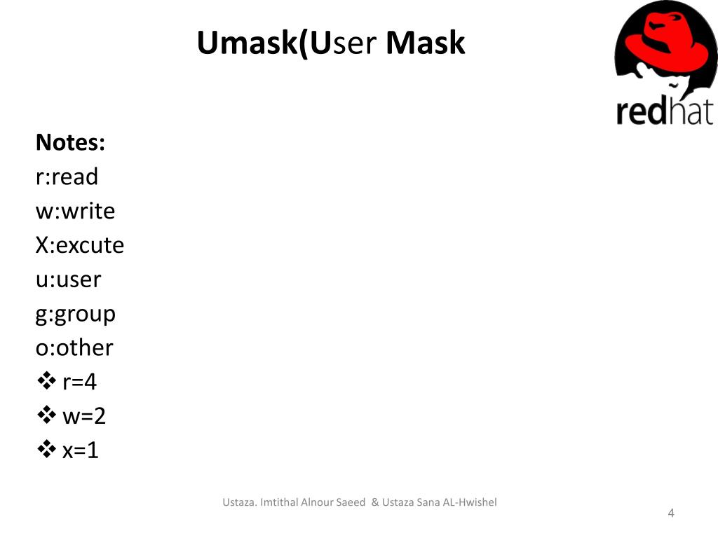 Umask(User Mask Notes: r:read w:write X:excute u:user g:group o:other • r=4 • w=2 • x=1 Ustaza. Imtithal Alnour Saeed & Ustaza Sana AL-Hwishel
