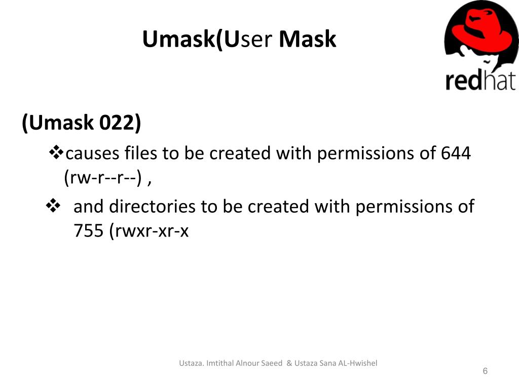 Umask(User Mask (Umask022) • causes files to be created with permissions of 644 (rw-r--r--) , • and directories to be created with permissions of 755 (rwxr-xr-x Ustaza. Imtithal Alnour Saeed & Ustaza Sana AL-Hwishel