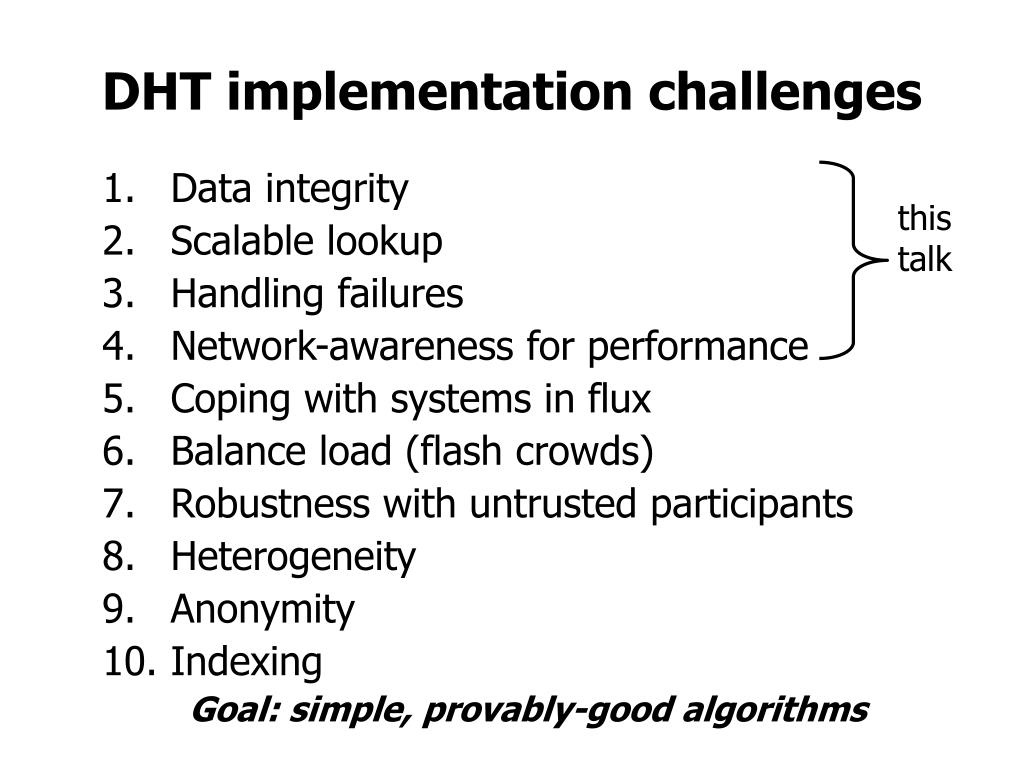 DHT implementation challenges this talk • Data integrity • Scalable lookup • Handling failures • Network-awareness for performance • Coping with systems in flux • Balance load (flash crowds) • Robustness with untrusted participants • Heterogeneity • Anonymity • Indexing Goal: simple, provably-good algorithms
