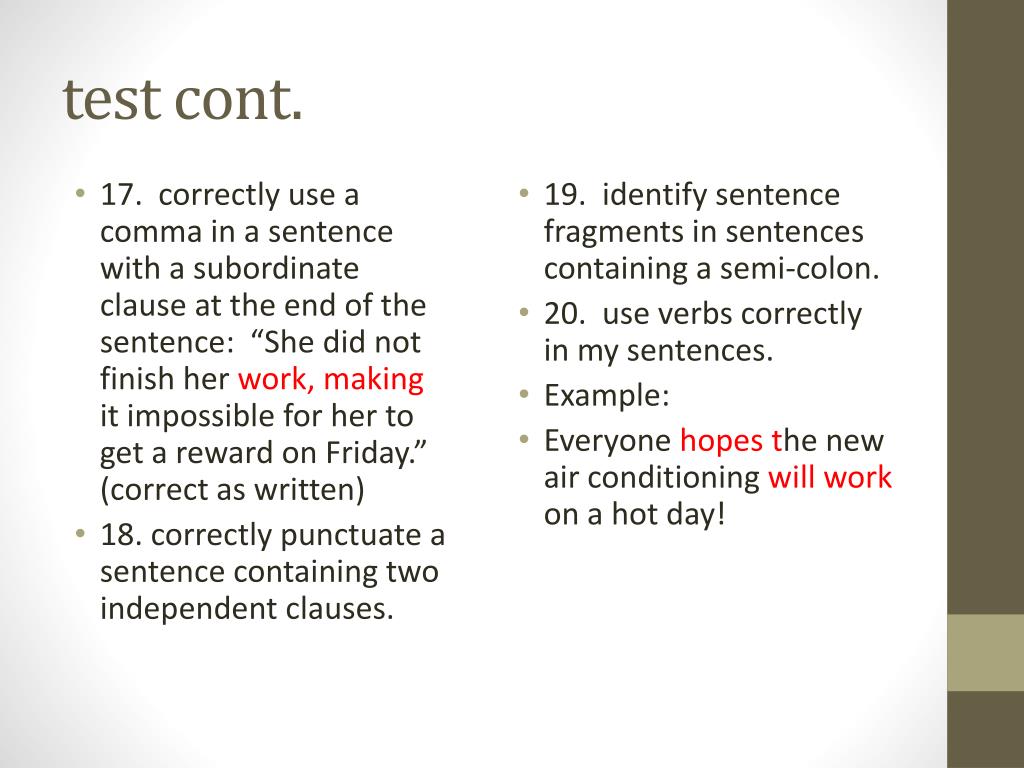 test cont. • 17. correctly use a comma in a sentence with a subordinate clause at the end of the sentence: “She did not finish her work, making it impossible for her to get a reward on Friday.” (correct as written) • 18. correctly punctuate a sentence containing two independent clauses. • 19. identify sentence fragments in sentences containing a semi-colon. • 20. use verbs correctly in my sentences. • Example: • Everyone hopes the new air conditioning will work on a hot day!
