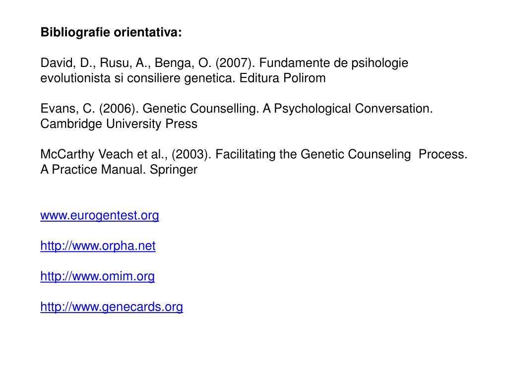 Bibliografie orientativa: David, D., Rusu, A., Benga, O. (2007). Fundamente de psihologie evolutionista si consiliere genetica. Editura Polirom Evans, C. (2006). Genetic Counselling. A Psychological Conversation. Cambridge University Press McCarthy Veach et al., (2003). Facilitating the Genetic Counseling Process. A Practice Manual. Springer www.eurogentest.org http://www.orpha.net http://www.omim.org http://www.genecards.org