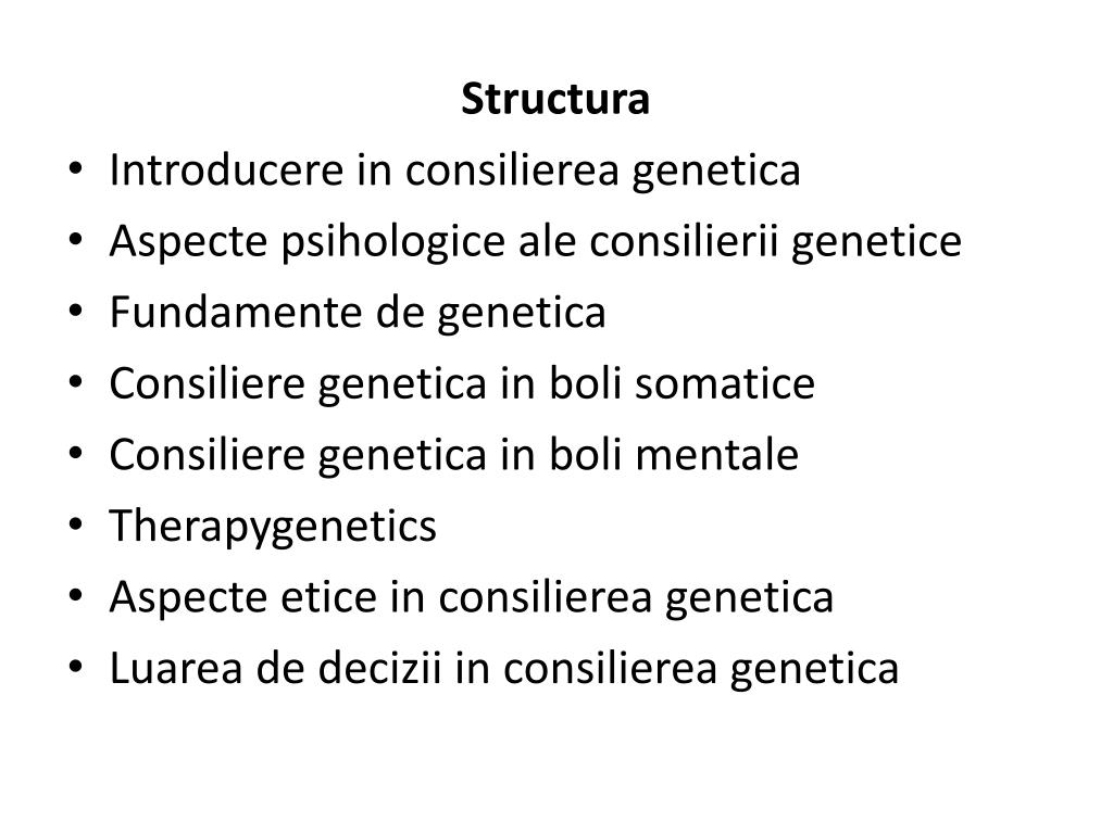 Structura • Introducere in consilierea genetica • Aspecte psihologice ale consilierii genetice • Fundamente de genetica • Consiliere genetica in boli somatice • Consiliere genetica in boli mentale • Therapygenetics • Aspecte etice in consilierea genetica • Luarea de decizii in consilierea genetica
