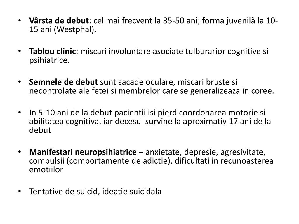 Vârsta de debut: cel mai frecvent la 35-50 ani; forma juvenilă la 10-15 ani (Westphal). • Tablou clinic: miscari involuntare asociate tulburarior cognitive si psihiatrice. • Semnele de debut sunt sacade oculare, miscari bruste si necontrolate ale fetei si membrelor care se generalizeaza in coree. • In 5-10 ani de la debut pacientii isi pierd coordonarea motorie si abilitatea cognitiva, iar decesul survine la aproximativ 17 ani de la debut • Manifestari neuropsihiatrice – anxietate, depresie, agresivitate, compulsii(comportamente de adictie), dificultati in recunoasterea emotiilor • Tentative de suicid, ideatie suicidala