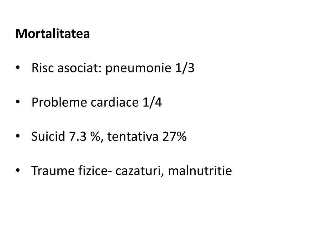 Mortalitatea • Risc asociat: pneumonie 1/3 • Probleme cardiace 1/4 • Suicid 7.3 %, tentativa 27% • Traume fizice- cazaturi, malnutritie