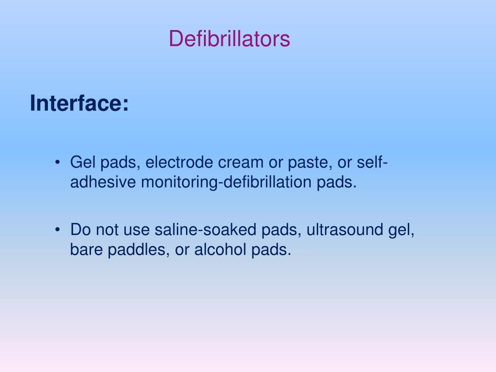 Defibrillators Interface: • Gel pads, electrode cream or paste, or self-adhesive monitoring-defibrillation pads. • Do not use saline-soaked pads, ultrasound gel, bare paddles, or alcohol pads.
