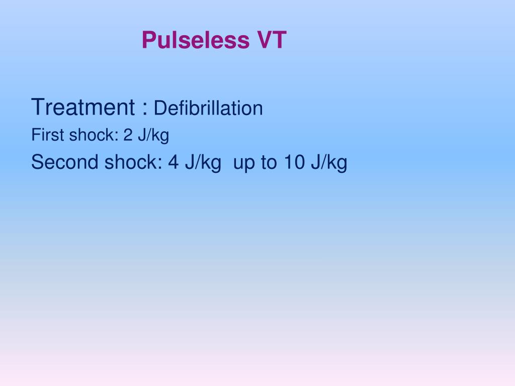 Pulseless VT Treatment : Defibrillation First shock: 2J/kg Second shock: 4J/kg up to 10 J/kg