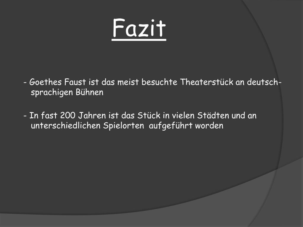 Fazit • Goethes Faust ist das meist besuchte Theaterstück an deutsch- • sprachigen Bühnen • In fast 200 Jahren ist das Stück in vielen Städten und an • unterschiedlichen Spielorten aufgeführt worden