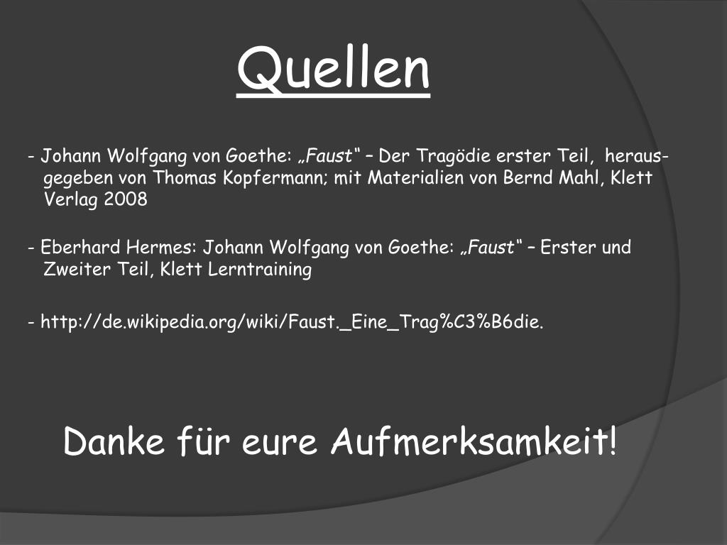 Quellen - Johann Wolfgang von Goethe: „Faust“ – Der Tragödie erster Teil, heraus- gegeben von Thomas Kopfermann; mit Materialien von Bernd Mahl, Klett Verlag 2008 • Eberhard Hermes: Johann Wolfgang von Goethe: „Faust“ – Erster und • Zweiter Teil, Klett Lerntraining - http://de.wikipedia.org/wiki/Faust._Eine_Trag%C3%B6die. Danke für eure Aufmerksamkeit!