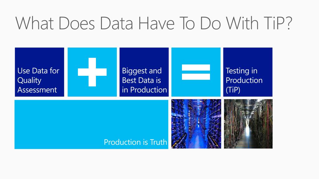 What Does Data Have To Do With TiP? Use Data for Quality Assessment Biggest and Best Data is in Production Testing in Production (TiP) Production is Truth