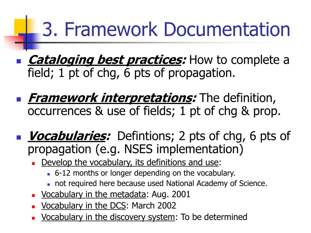 3. Framework Documentation • Cataloging best practices: How to complete a field; 1 pt of chg, 6 pts of propagation. • Framework interpretations: The definition, occurrences & use of fields; 1 pt of chg & prop. • Vocabularies: Defintions; 2 pts of chg, 6 pts of propagation (e.g. NSES implementation) • Develop the vocabulary, its definitions and use: • 6-12 months or longer depending on the vocabulary. • not required here because used National Academy of Science. • Vocabulary in the metadata: Aug. 2001 • Vocabulary in the DCS: March 2002 • Vocabulary in the discovery system: To be determined