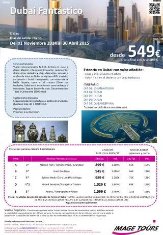 OFERTA Dubai Fantástico 5 días Días de salida: Diario. Del 01 Noviembre 2014 al 30 Abril 2015 desde549€ precio final con tasas 899 € Servicios Incluidos Vuelos internacionales TurkishAirlines en clase V desde Madrid y Barcelona (consultar suplementos desde otras ciudades y otras clases/cías. aéreas), 4 noches de hotel en Dubai en régimen A/D, traslados aeropuerto – hotel – aeropuerto, con asistencia de habla hispana, cena en el crucero Dhow con traslados, Safari en el desierto con cena barbacoa y transporte. Seguro básico de viaje. Documentación, Tasas y Carburante (350€ neto). Suplementos Variables Seguro ampliación coberturas y gastos de anulación (hasta un máx. de 1.500€): 45 € Pago en destino Propinas: a su discreción. Estancia en Dubai con valor añadido: - Cena y mini-crucero en Dhow - Safari 4 x 4 en el desierto con cena barbacoa ITINERARIO DÍA 01: ESPAÑA/DUBAI DÍA 02: DUBAI DÍA 03: DUBAI DÍA 04: DUBAI DÍA 05: DUBAI/ESPAÑA *consultar detalle en nuestra web. Precios por persona - Mínimo 2 participantes Vuelos Regulares. Condiciones especiales tarifas Turkish Airlines: En caso de cancelación o cambio de billetes antes de la salida habrá una penalización de 100€ por persona. En caso de cancelación dentro de las 24 horas anteriores a la salida, la penalización es del 100% del importe de la tarifa. La tasa de combustible (YQ o YR) no es reembolsable en ningún caso Consulte suplementos para reservas de 1 persona Ref.056E. 16/09/14:: Image Tours, S.A. Pso. San Juan 62 ent 1ª 08009 Barcelona - Org Técnica GC 26 MCondiciones generales en WWW.IMAGETOURS.ESPrecios sujetos a revisión según art. 157 del R.D.L. 1/2007. Requisitos Turistas UE: pasaporte con vigencia superior a 6 meses desde la fecha de inicio del viaje. Turistas no UE: consultar con su embajada. Los precios finales indicados podrán verse incrementados con el importe de los gastos de gestión que estime oportuno cobrar la agencia de viajes minorista.