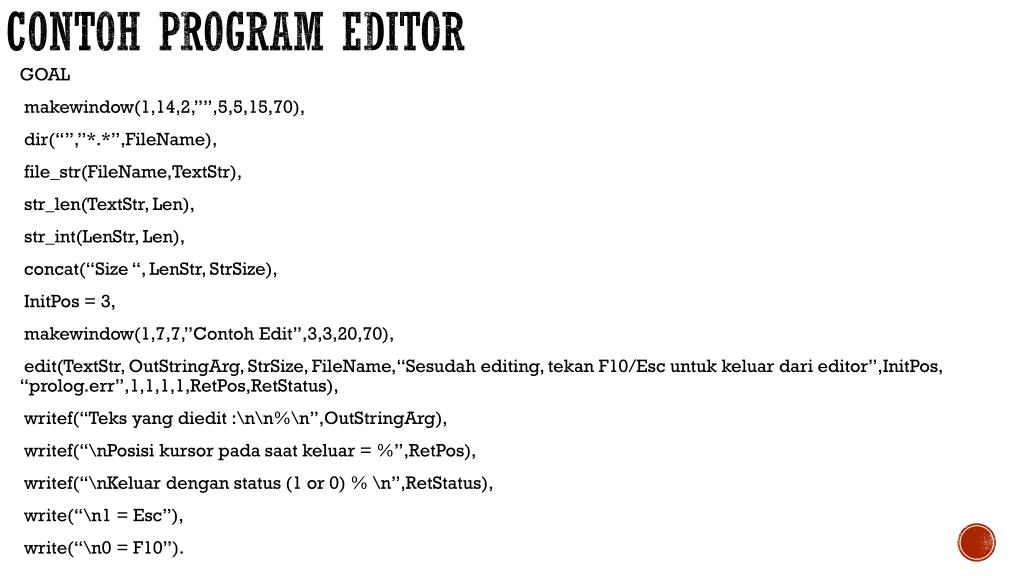 Contoh program editor GOAL makewindow(1,14,2,””,5,5,15,70), dir(“”,”*.*”,FileName), file_str(FileName,TextStr), str_len(TextStr, Len), str_int(LenStr, Len), concat(“Size “, LenStr, StrSize), InitPos = 3, makewindow(1,7,7,”Contoh Edit”,3,3,20,70), edit(TextStr, OutStringArg, StrSize, FileName,“Sesudah editing, tekan F10/Esc untuk keluar dari editor”,InitPos, “prolog.err”,1,1,1,1,RetPos,RetStatus), writef(“Teks yang diedit :\n\n%\n”,OutStringArg), writef(“\nPosisi kursor pada saat keluar = %”,RetPos), writef(“\nKeluar dengan status (1 or 0) % \n”,RetStatus), write(“\n1 = Esc”), write(“\n0 = F10”).