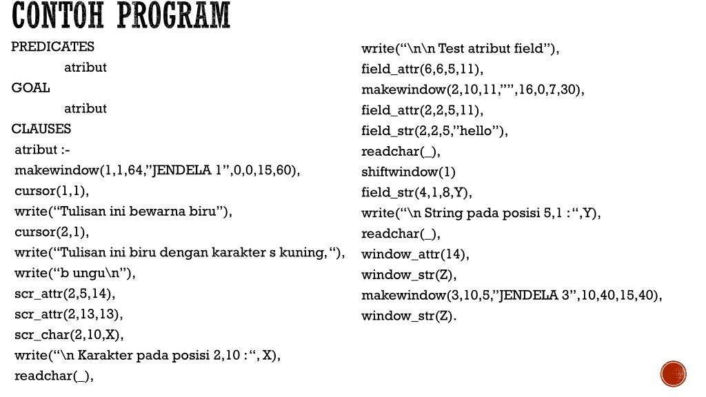 Contoh program PREDICATES atribut GOAL atribut CLAUSES atribut :- makewindow(1,1,64,”JENDELA 1”,0,0,15,60), cursor(1,1), write(“Tulisan ini bewarna biru”), cursor(2,1), write(“Tulisan ini biru dengan karakter s kuning, “), write(“b ungu\n”), scr_attr(2,5,14), scr_attr(2,13,13), scr_char(2,10,X), write(“\n Karakter pada posisi 2,10 : “, X), readchar(_), write(“\n\n Test atribut field”), field_attr(6,6,5,11), makewindow(2,10,11,””,16,0,7,30), field_attr(2,2,5,11), field_str(2,2,5,”hello”), readchar(_), shiftwindow(1) field_str(4,1,8,Y), write(“\n String pada posisi 5,1 : “,Y), readchar(_), window_attr(14), window_str(Z), makewindow(3,10,5,”JENDELA 3”,10,40,15,40), window_str(Z).
