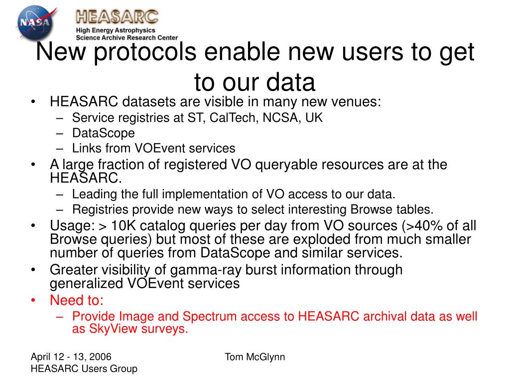 What do we get out of it. • HEASARC access to data. • New markets for HEASARC data • Integrated archive access to NASA/ground data. • Using HEASARC data in standardized tools. • Cross-pollination with other VO providers. • HEASARC leadership in the community. Tom McGlynn