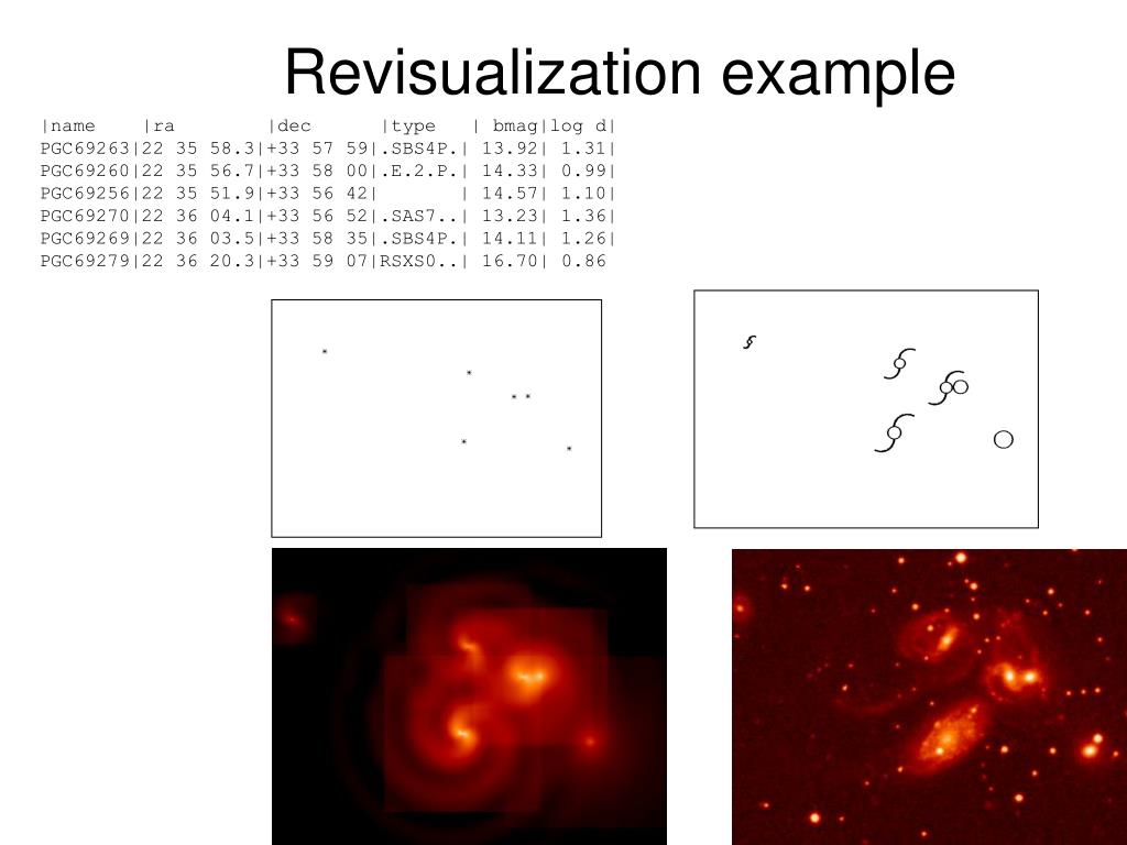 Revisualization example |name |ra |dec |type | bmag|log d| PGC69263|22 35 58.3|+33 57 59|.SBS4P.| 13.92| 1.31| PGC69260|22 35 56.7|+33 58 00|.E.2.P.| 14.33| 0.99| PGC69256|22 35 51.9|+33 56 42| | 14.57| 1.10| PGC69270|22 36 04.1|+33 56 52|.SAS7..| 13.23| 1.36| PGC69269|22 36 03.5|+33 58 35|.SBS4P.| 14.11| 1.26| PGC69279|22 36 20.3|+33 59 07|RSXS0..| 16.70| 0.86