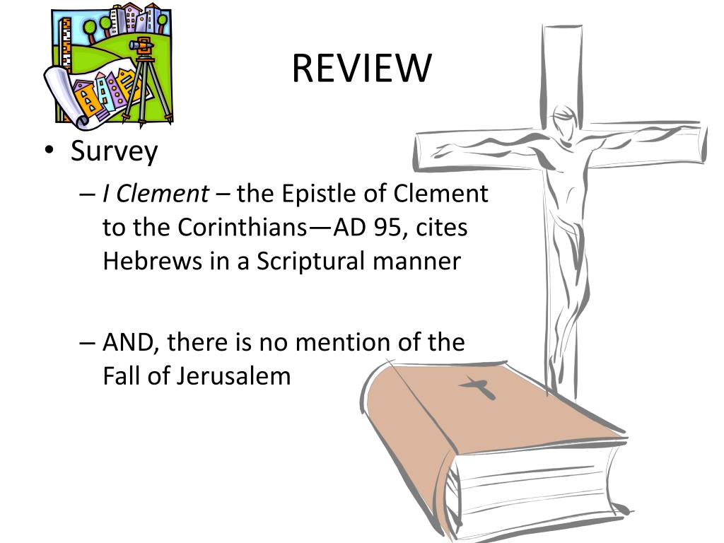 Hebrews. Persevere in Jesus LESSON V. REVIEW. Survey I Clement – the Epistle of Clement to the Corinthians—AD 95, cites Hebrews in a Scriptural manner AND, there is no mention of the Fall of Jerusalem. REVIEW.