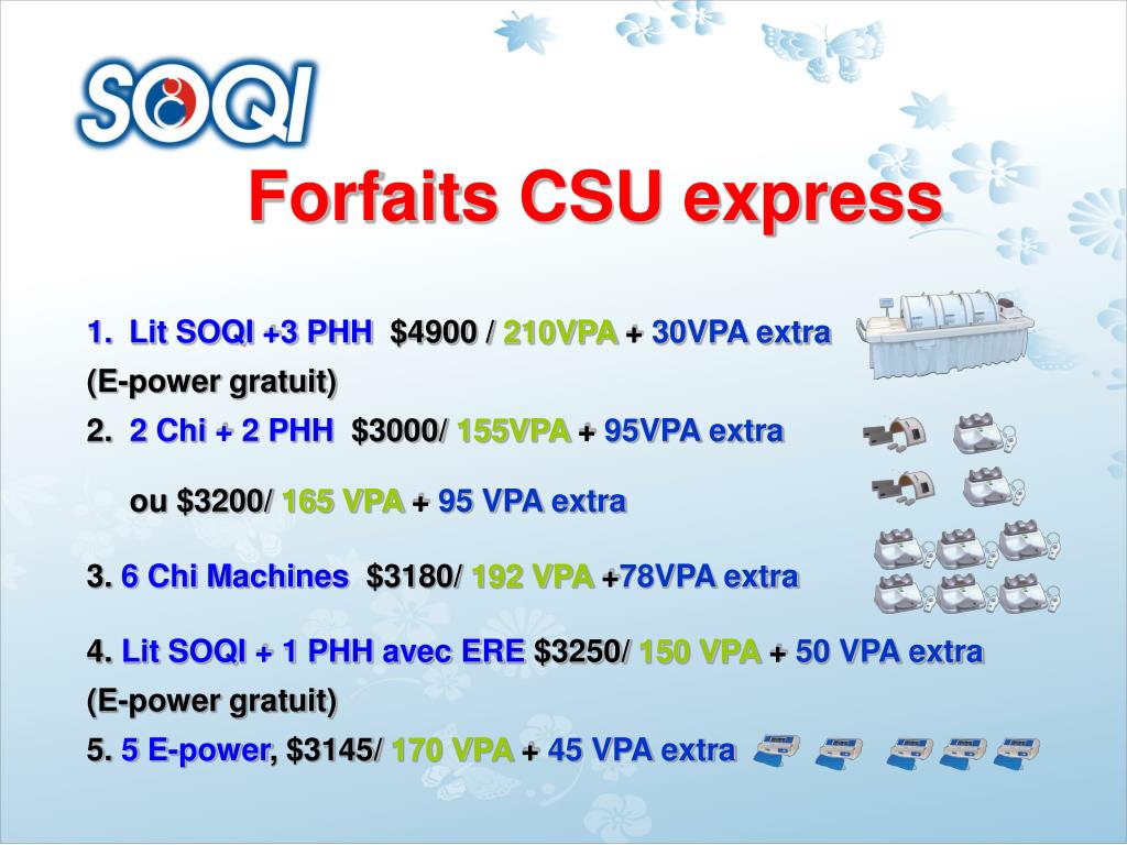 Forfaits CSU express • Lit SOQI +3 PHH$4900 / 210VPA + 30VPA extra • (E-power gratuit) • 2. 2 Chi + 2 PHH $3000/ 155VPA + 95VPA extra • ou $3200/ 165 VPA + 95 VPA extra • 3. 6 Chi Machines $3180/ 192 VPA +78VPA extra • 4. Lit SOQI + 1 PHH avec ERE $3250/ 150 VPA + 50 VPA extra • (E-power gratuit) • 5. 5 E-power, $3145/ 170 VPA + 45 VPA extra