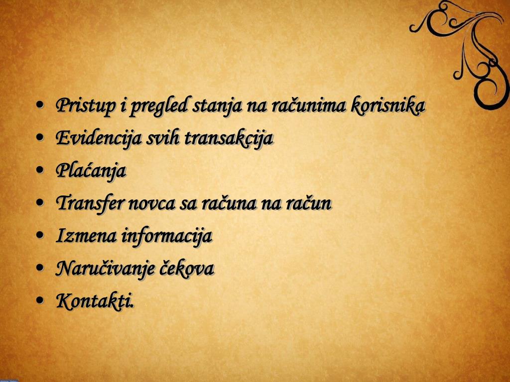 Pristup i pregled stanja na računima korisnika • Evidencija svih transakcija • Plaćanja • Transfer novca sa računa na račun • Izmena informacija • Naručivanje čekova • Kontakti.