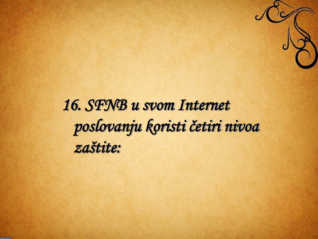 16. SFNB u svom Internet poslovanju koristi četiri nivoa zaštite: