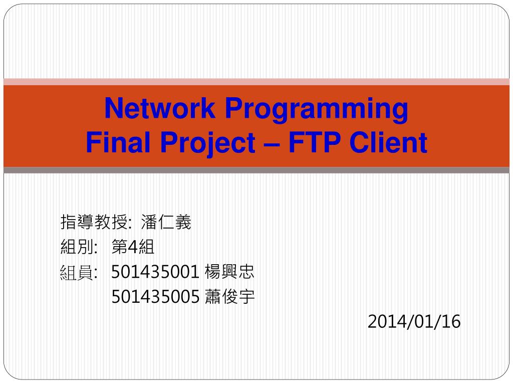 Network ProgrammingFinal Project – FTP Client 指導教授: 潘仁義 組別: 第4組 組員: 501435001 楊興忠 501435005 蕭俊宇 2014/01/16