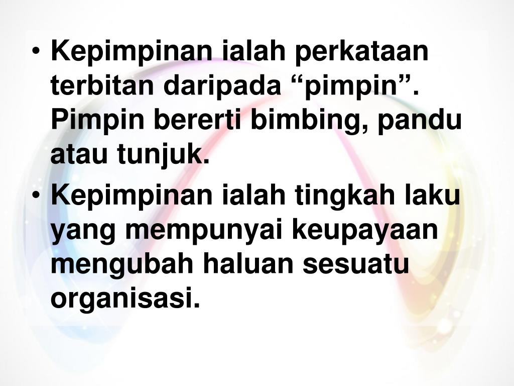 Kepimpinan ialah perkataan terbitan daripada “pimpin”. Pimpin bererti bimbing, pandu atau tunjuk. • Kepimpinan ialah tingkah laku yang mempunyai keupayaan mengubah haluan sesuatu organisasi.