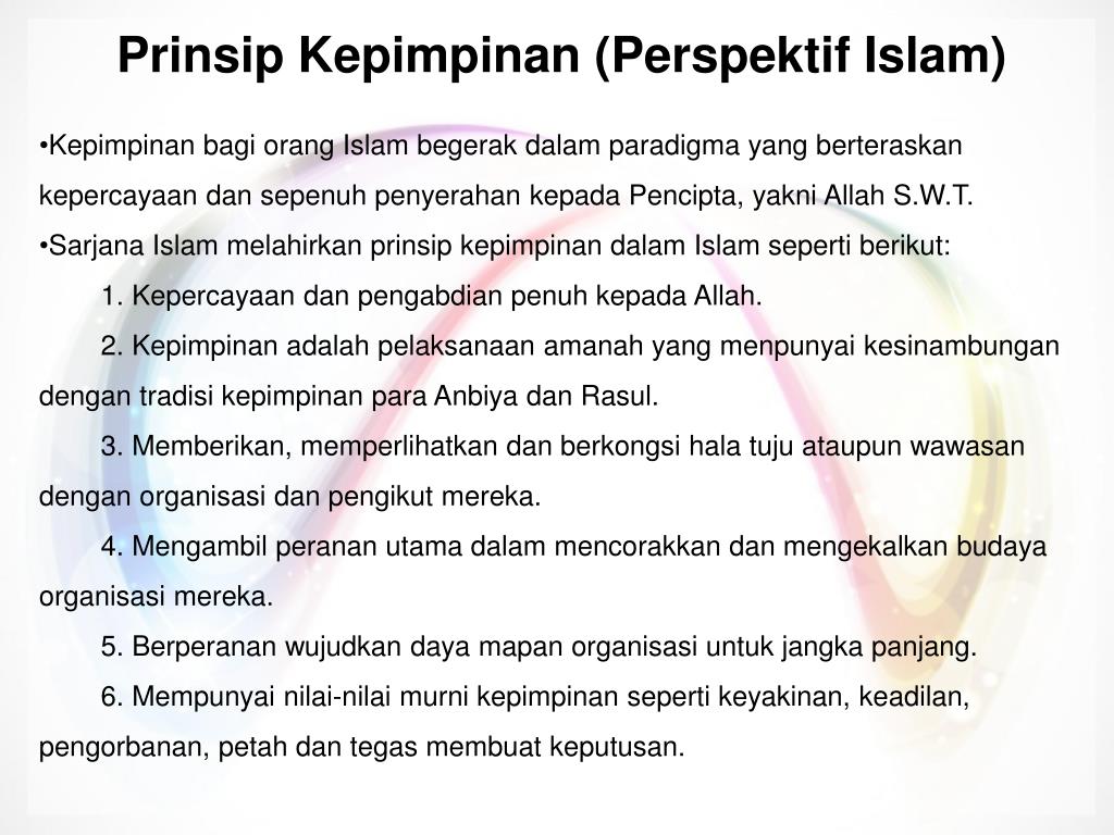 PrinsipKepimpinan (Perspektif Islam) • Kepimpinanbagi orang Islam begerakdalamparadigma yang berteraskankepercayaandansepenuhpenyerahankepadaPencipta, yakni Allah S.W.T. • Sarjana Islam melahirkanprinsipkepimpinandalam Islam sepertiberikut: • 1. Kepercayaandanpengabdianpenuhkepada Allah. • 2. Kepimpinanadalahpelaksanaanamanahyang menpunyaikesinambungandengantradisikepimpinanparaAnbiyadanRasul. • 3. Memberikan, memperlihatkandanberkongsihalatujuataupunwawasandenganorganisasidanpengikutmereka. • 4. Mengambilperananutamadalammencorakkandanmengekalkanbudayaorganisasimereka. • 5. Berperananwujudkandayamapanorganisasiuntukjangkapanjang. • 6. Mempunyainilai-nilaimurnikepimpinansepertikeyakinan, keadilan, pengorbanan, petahdantegasmembuatkeputusan.