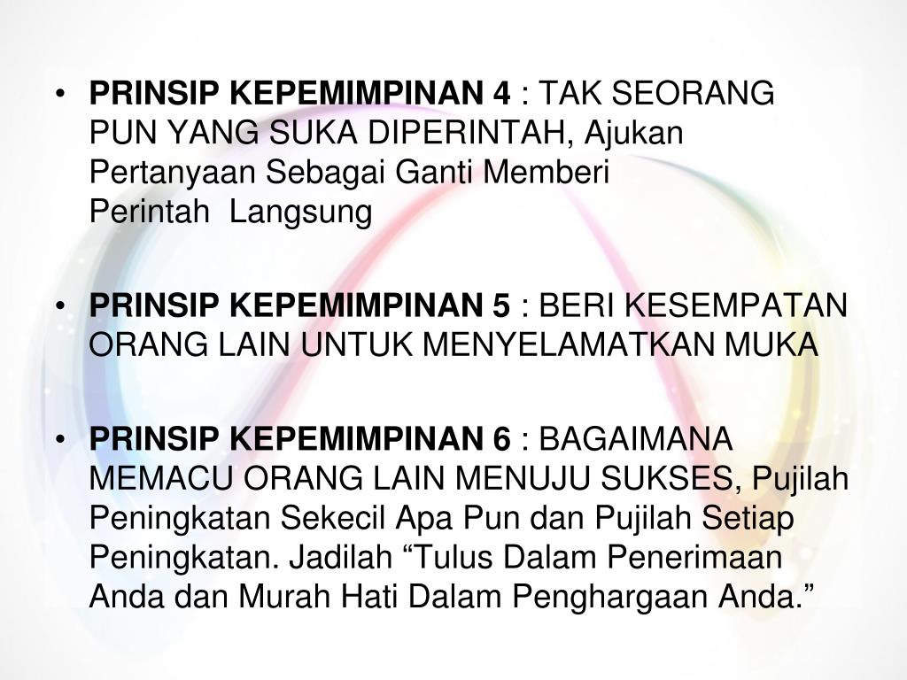 PRINSIP KEPEMIMPINAN 4 : TAK SEORANG PUN YANG SUKA DIPERINTAH, AjukanPertanyaanSebagaiGantiMemberiPerintahLangsung • PRINSIP KEPEMIMPINAN 5 : BERI KESEMPATAN ORANG LAIN UNTUK MENYELAMATKAN MUKA • PRINSIP KEPEMIMPINAN 6 : BAGAIMANA MEMACU ORANG LAIN MENUJU SUKSES, PujilahPeningkatanSekecilApa Pun danPujilahSetiapPeningkatan. Jadilah “TulusDalamPenerimaanAndadanMurahHatiDalamPenghargaanAnda.”