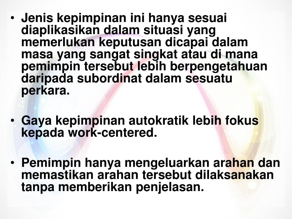 Ciri-ciri • Cenderung untuk memimpin dan menggunakan kuasa secara paksaan. • Mereka suka mendominasi. • Terdapat kuasa mutlak di mana setiap orang bawahan mesti menerima akibat daripada keputusan yang dibuat sama ada baik atau buruk.