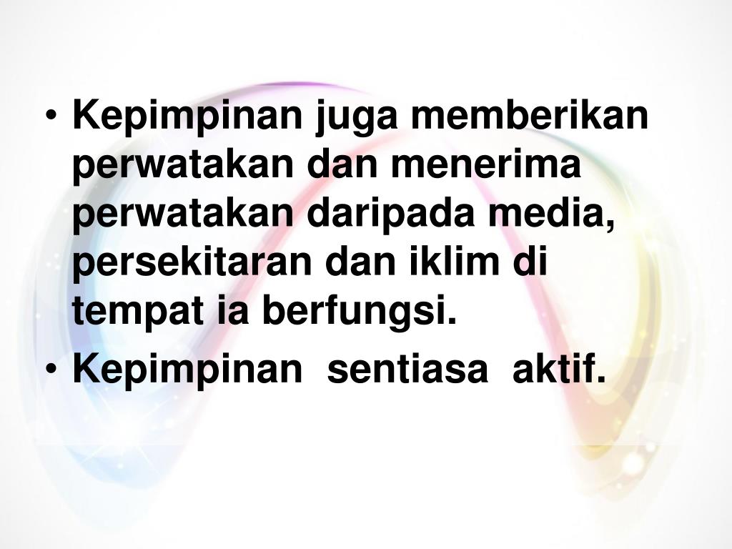 Kepimpinan juga memberikan perwatakan dan menerima perwatakan daripada media, persekitaran dan iklim di tempat ia berfungsi. • Kepimpinan sentiasa aktif.