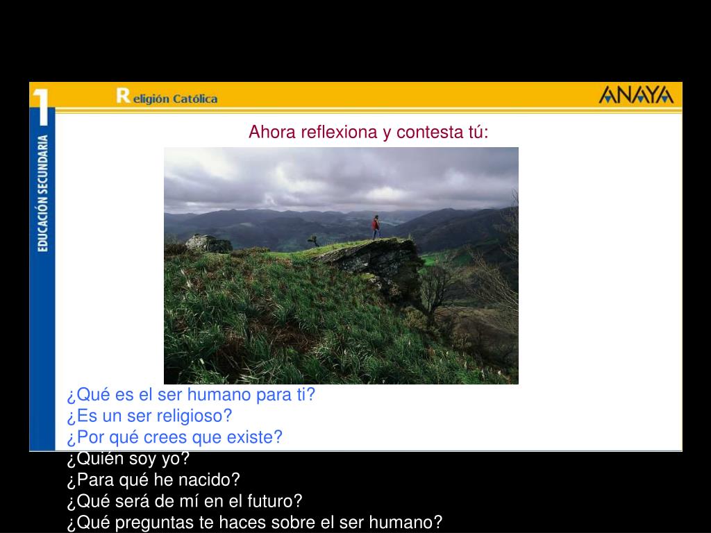 Ahora reflexiona y contesta tú: ¿Qué es el ser humano para ti? ¿Es un ser religioso? ¿Por qué crees que existe? ¿Quién soy yo? ¿Para qué he nacido? ¿Qué será de mí en el futuro? ¿Qué preguntas te haces sobre el ser humano?