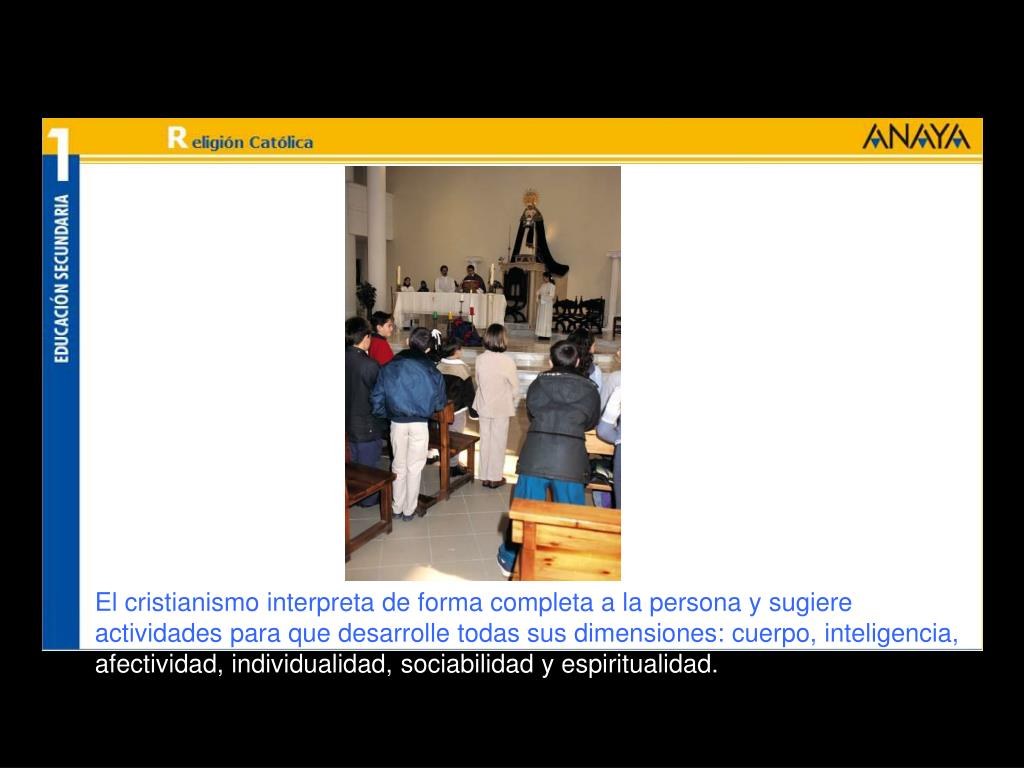 El cristianismo interpreta de forma completa a la persona y sugiere actividades para que desarrolle todas sus dimensiones: cuerpo, inteligencia, afectividad, individualidad, sociabilidad y espiritualidad.