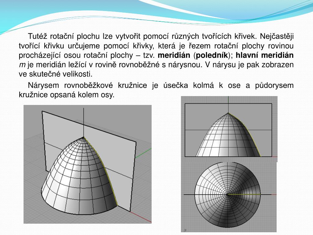 Tutéž rotační plochu lze vytvořit pomocí různých tvořících křivek. Nejčastěji tvořící křivku určujeme pomocí křivky, která je řezem rotační plochy rovinou procházející osou rotační plochy – tzv. meridián (poledník); hlavní meridiánm je meridián ležící v rovině rovnoběžné s nárysnou. V nárysu je pak zobrazen ve skutečné velikosti. Nárysem rovnoběžkové kružnice je úsečka kolmá k ose a půdorysem kružnice opsaná kolem osy.
