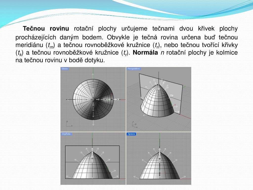Tečnou rovinu rotační plochy určujeme tečnami dvou křivek plochy procházejících daným bodem. Obvykle je tečná rovina určena buď tečnou meridiánu (tm) a tečnou rovnoběžkové kružnice (tr), nebo tečnou tvořící křivky (tk) a tečnou rovnoběžkové kružnice (tr). Normálan rotační plochy je kolmice na tečnou rovinu v bodě dotyku.